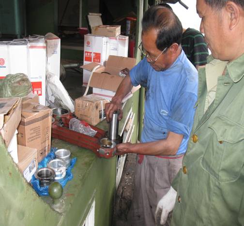 胡師傅在對主機(jī)曲軸飛輪組進(jìn)行檢查維修