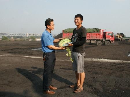 公司黨委書記、董事長(zhǎng)劉曹應(yīng)帶隊(duì)為碼頭業(yè)務(wù)員送上西瓜、礦泉水等消暑物品