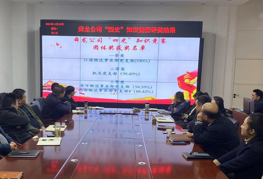 競賽期間,公司每天上午九點在釘釘APP上發(fā)布“四史”知識競賽測試題,并于第二天在公司工作群發(fā)布前一天“四史”知識競賽答題情況,公布參賽人數(shù)、職工人數(shù)、各支部參賽率以及獲得滿分參與抽獎人員名單。為了鼓勵全體職工積極參與此次“四史”知識競賽活動,此次競賽活動設(shè)團體獎和個人獎,團體獎以公司四個支部五天平均參賽率評選出一、二、三等獎,個人獲獎?wù)咴诖痤}正確率為百分百的黨員職工中以抽獎方式產(chǎn)生。此次競賽活動四個支部最高參賽率達到100%,最低參賽率也達到88%,參賽總?cè)舜芜_到723人次,滿分人次達到549人次。經(jīng)過五天的比賽,最終江海物流事業(yè)部黨支部以總參賽率100%獲得團體一等獎,機關(guān)黨支部以99.49%獲得團體二等獎、淮河物流事業(yè)部和西部物流事業(yè)部黨支部分別以94.59%、88.42%獲得團體三等獎。王海、石欣欣、周傳輝、程佑仁、徐煜、赫文洲、黃飛、徐新懷、趙仁勇、蔣春慧等10人獲得個人獎。、