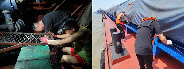 江海物流事業(yè)部許勇、魏振元在江輪開航前檢查機(jī)器、封艙