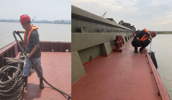 江海物流事業(yè)部石秀望、黃河在整理纜繩、測量船舶吃水線