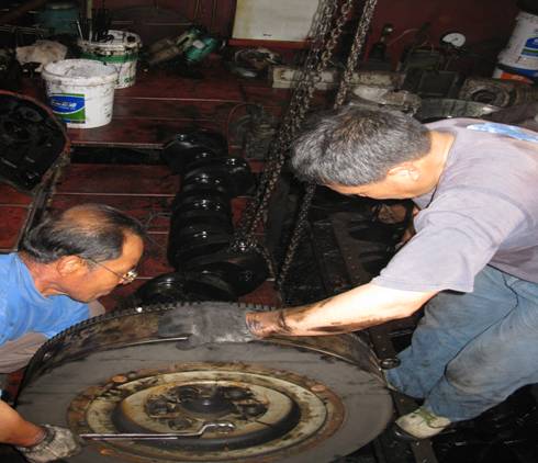 胡師傅在對主機(jī)曲軸飛輪組進(jìn)行檢查維修