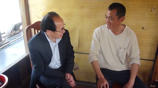 經過一夜航行,15日上午,船隊已行至高郵附近,雖然在震耳欲聾的機器轟鳴聲中大家都沒休息好,但船隊仍以每小時4、5公里的速度不知疲倦地前行。在12號隊隊長劉永玉的陪同下,董事長余龍懷帶著同行的公司副經理助理、航運部部長田學銀,副經理助理、黨群工作部(人力資源部)部長梁斌來到駁船上,與每條駁船上的船員進行談心。