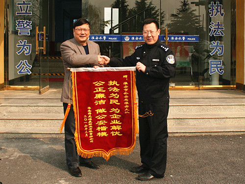 圖(左一)為公司總經理馬剛為淮安市公安局水上警察支隊淮安大隊送錦旗