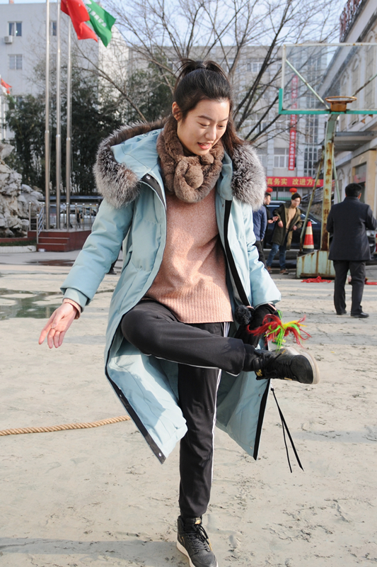 踢毽子比賽賽場上,選手們身手敏捷、精神抖擻,只見五彩的毽子高低起伏、上下翻飛。